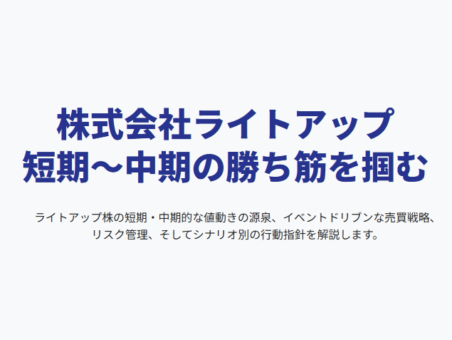 ライトアップは、独自性のある強みを武器に持続的な成長が見込める一方、政策依存などの固有のリスク管理がカギとなる銘柄です。投資家にとっては、同社が中期ビジョン「年商100億・1万社支援企業」へ飛躍できるかが最大のポイントでしょう。現状の株価は成長期待を織り込んでいるものの、計画を超える業績拡大が実現すれば、さらなる評価の余地もあります。
